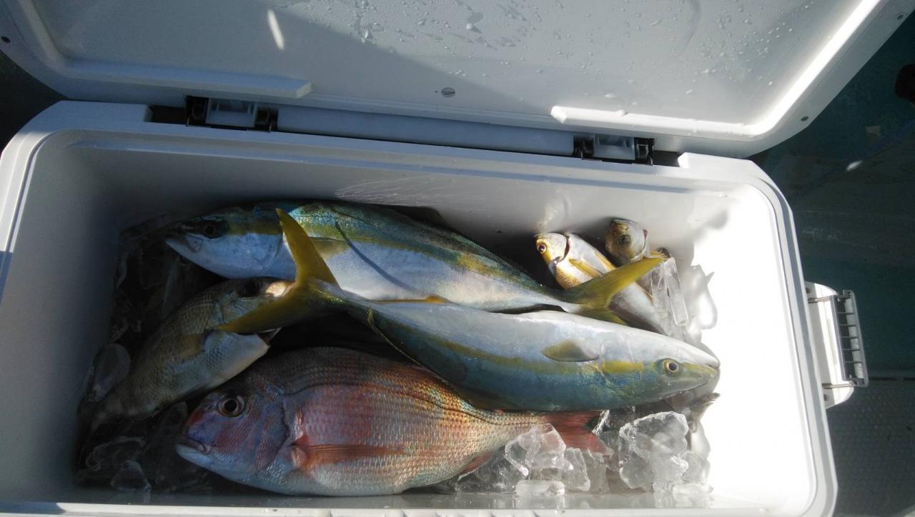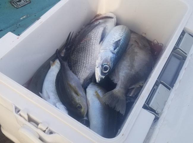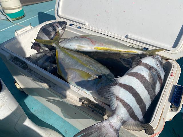 石鯛、シマアジ、ウマヅラ、メジナ、イサキ、アジ、鯖、等混じりクーラー満タンいいお土産になりました!